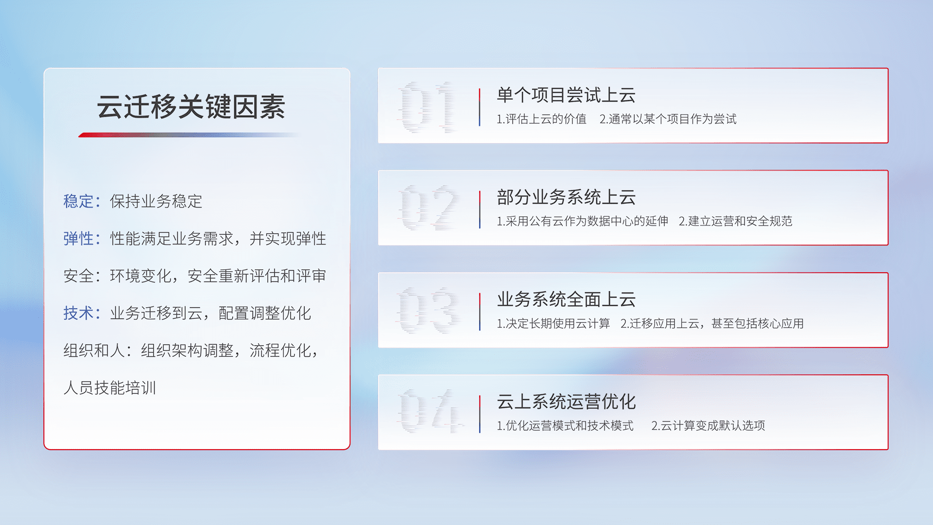 结合实际业务,,从规划设计、、、云平台选型、、、云原生改造、、数据迁移、、集成交付,,,迁移全过程为客户识别最佳上云路径,,,,做好风险识别管理,,设计网络架构、、身份权限、、、、安全审计合规、、、、操作审计、、日志审计、、、、监控告警策略、、多站点容灾设计等,,对云上基础设施进行整体规划,,,,提升IT治理水平,,,,以满足弹性、、高可用、、高性能的需求。。