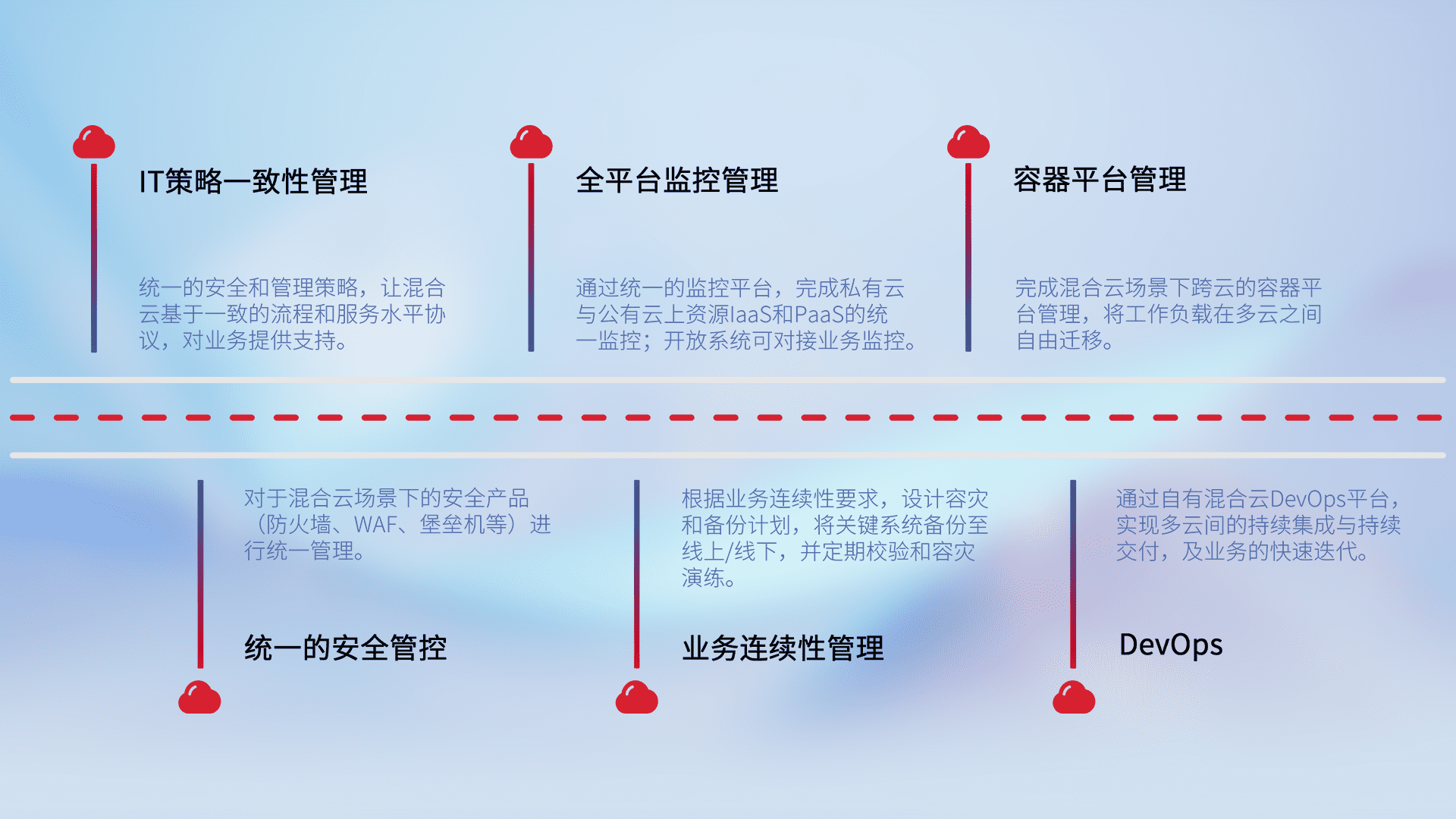 通过多云纳管,,,以统一的资源数据模型把客户的云资源进行抽象和封装,,进而实现对多云资源的统一操作,,保障云资源管理的可靠性、、、稳定性与可用性。。。。量身定制化运维内容,,,配置、、开发运维、、、、补丁管理、、备份、、监控、、认证和访问管理、、、、审计和日常巡检等,,,保障在用云过程中的可靠度,,稳定度以及高可用率。。。。